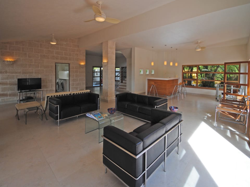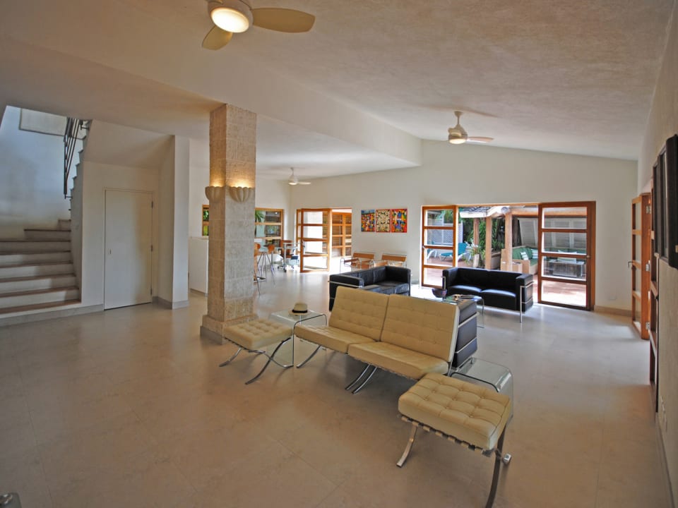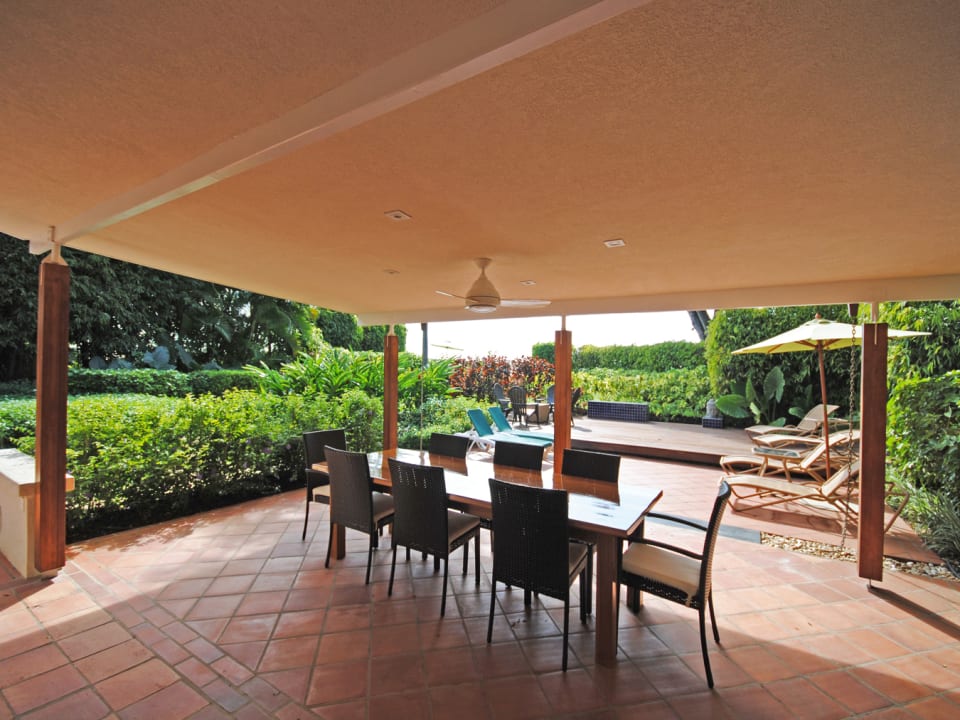 The elegant open-plan living areas, which are surrounded by spacious outdoor terraces and decks, are complemented by high, vaulted ceilings. The main house features 2 en suite, air-conditioned bedrooms on the upper level, while a further 2 guest suites, along with a family/media room, are located just off the courtyard terrace.